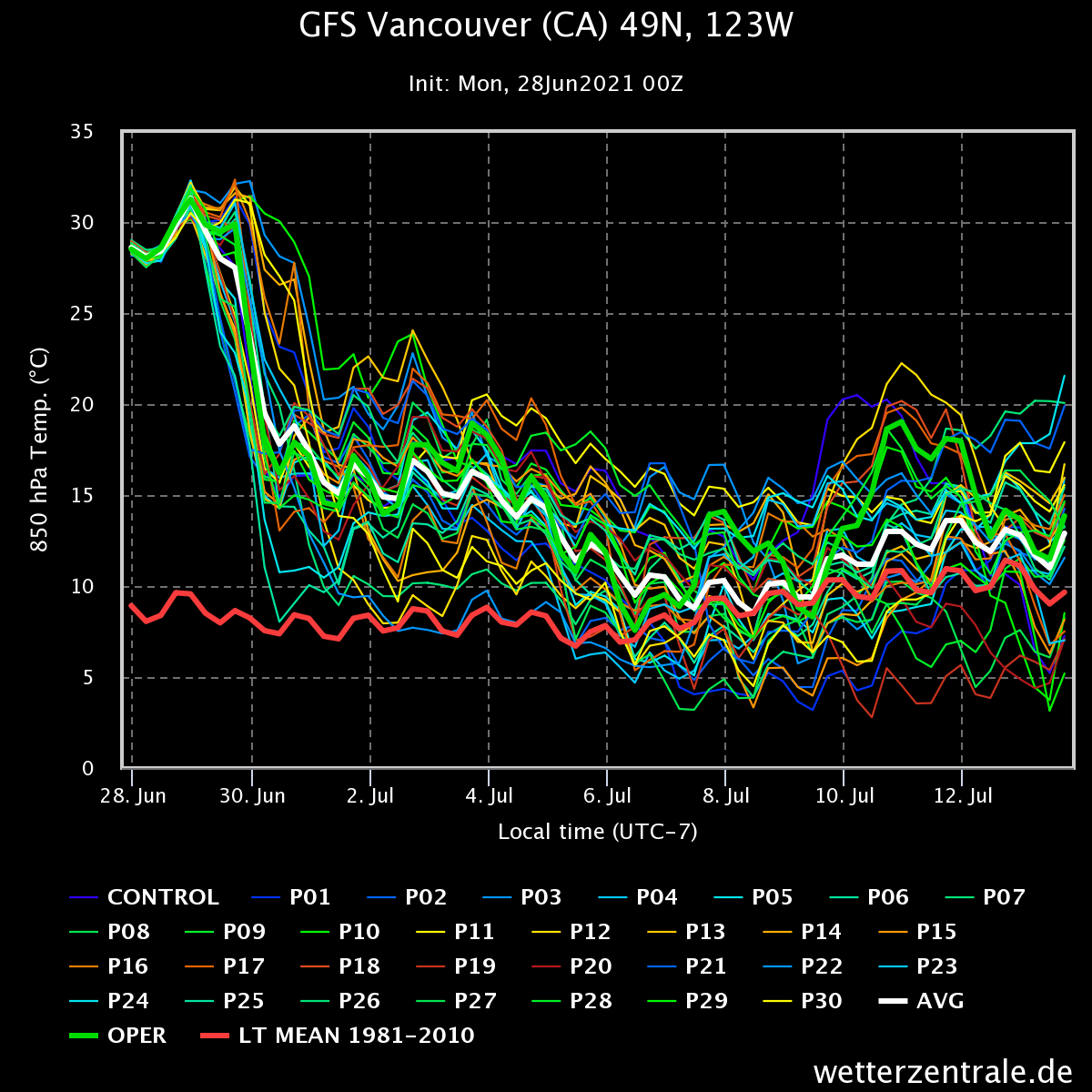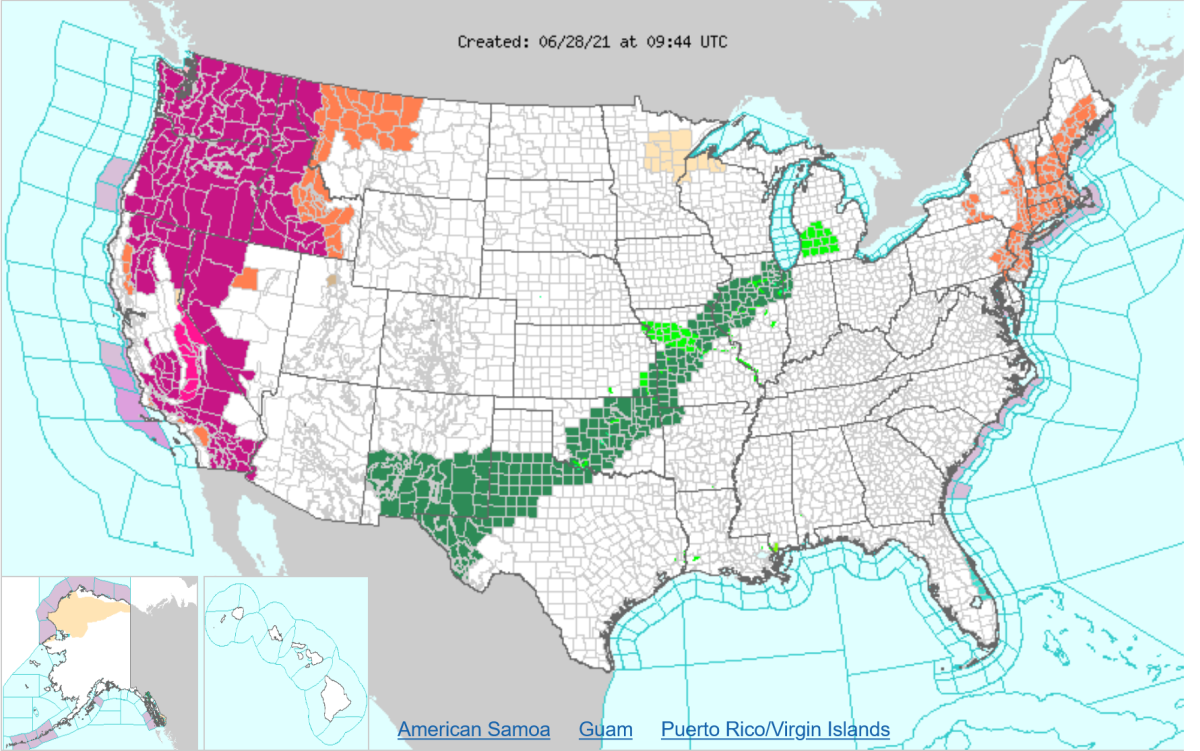 Varování před vysokými teplotami (fialová barva) platí pro celý Oregon, Washington i přilehlé oblasti sousedních států