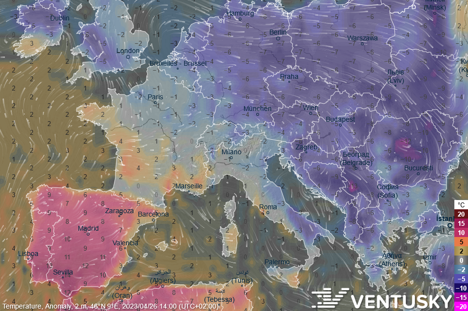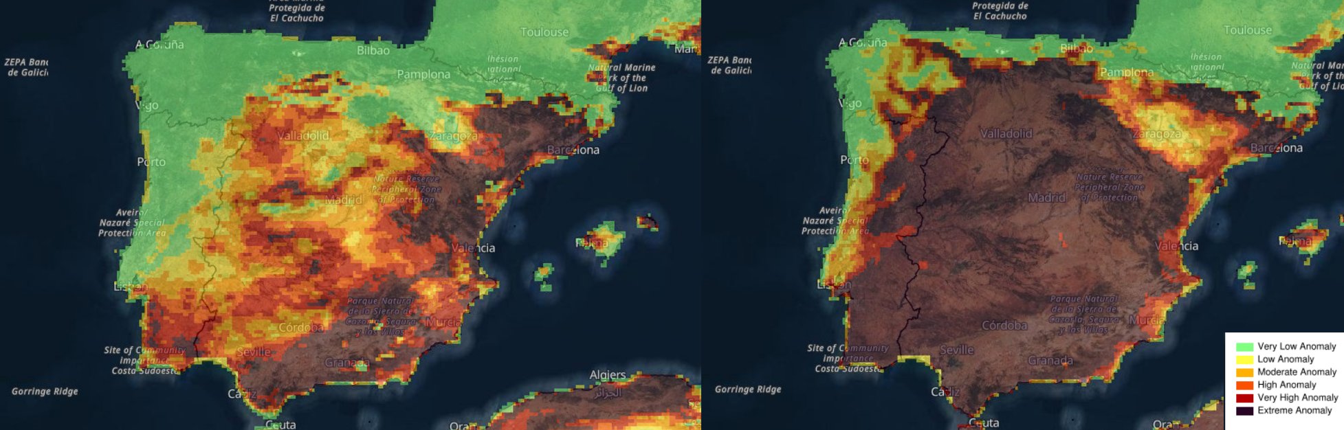 Odchylka nebezpečí vzniku požárů pro konec dubna – srovnání v pondělí (vlevo) a ve čtvrtek (vpravo) podle modelu ECMWF