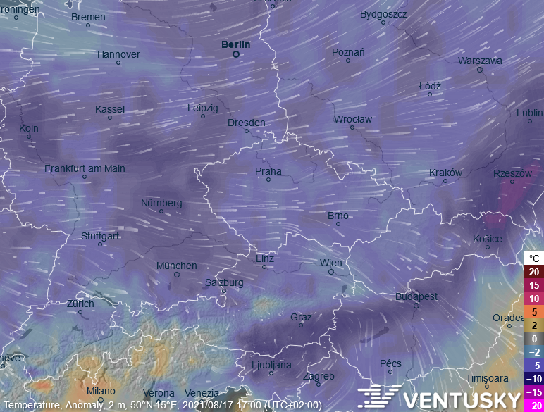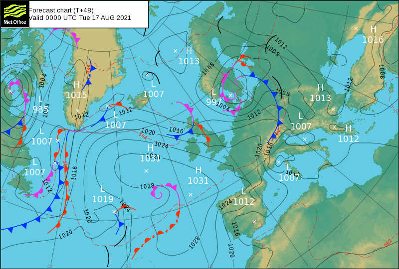 Synoptická situace v noci z pondělí na úterý - do střední Evropy začne proudit chladný vzduch od severozápadu