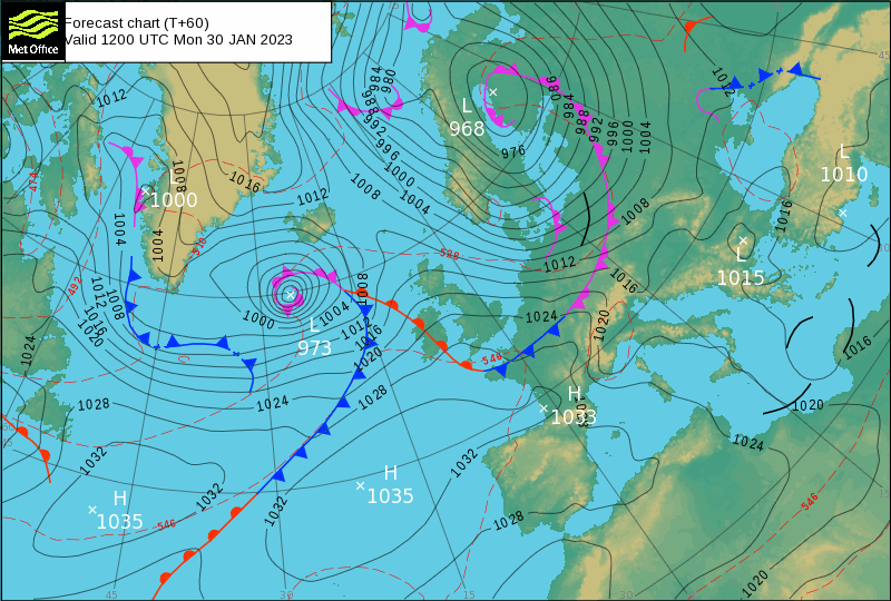 Synoptická situace v pondělí v poledne - počasí u nás ovlivní okluzní fronta. Další systémy budou následovat