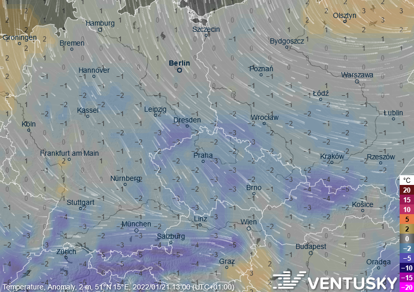 Odchylka teploty vzduchu v pátek 21. ledna odpoledne vůči průměru 1981-2020 - vrátí se průměrné až lehce podprůměrné teploty