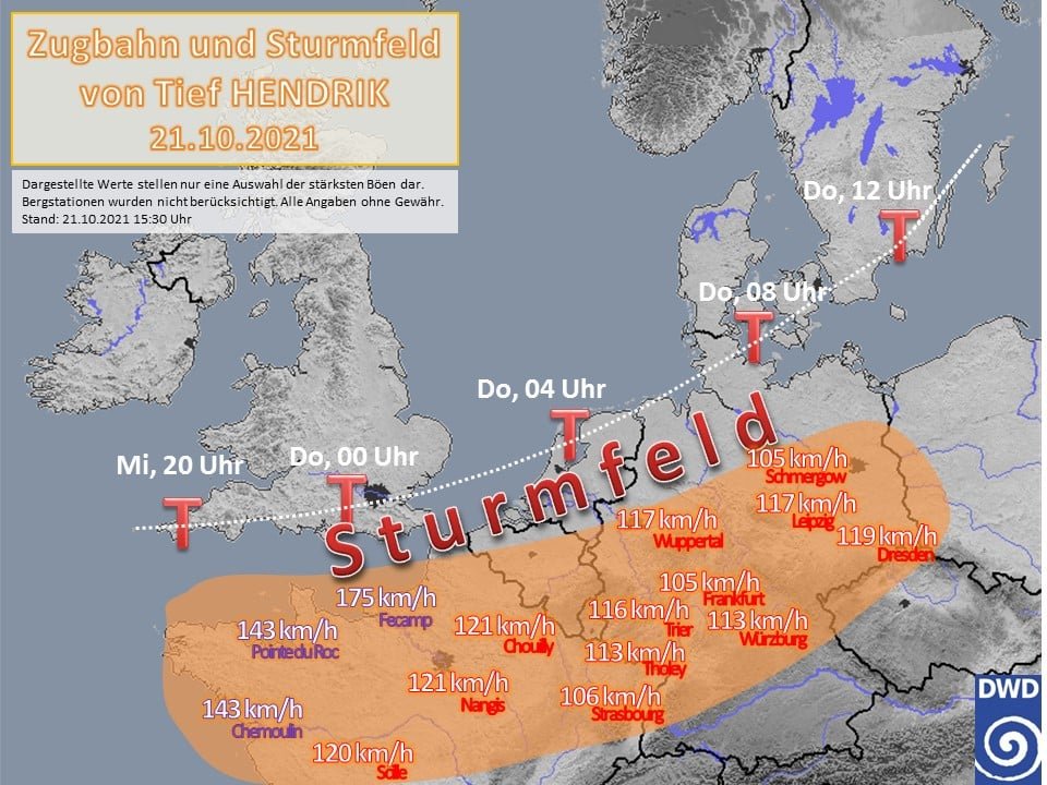 Na mapě je vyznačena oblast, kde dnes byly dosahovány nárazy větru kolem 100 km/h