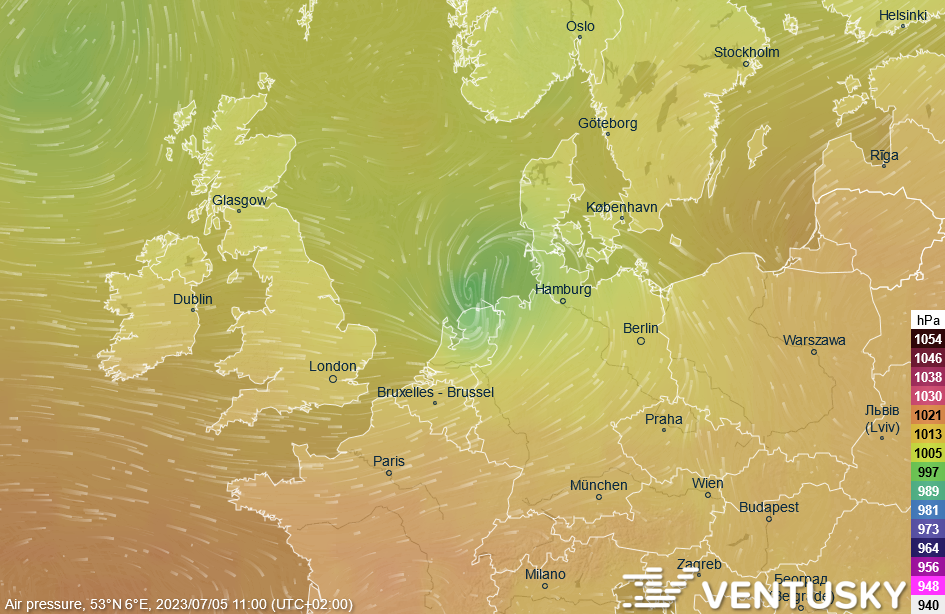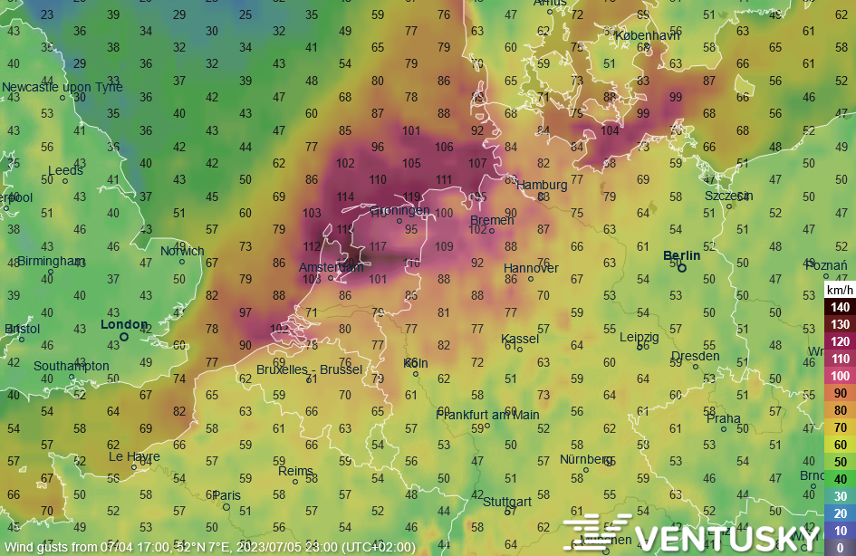 Maximální nárazy větru za středu na severu Německa a v Beneluxu