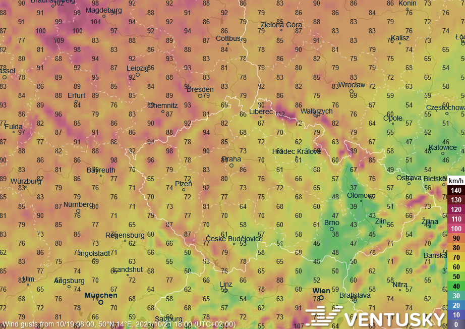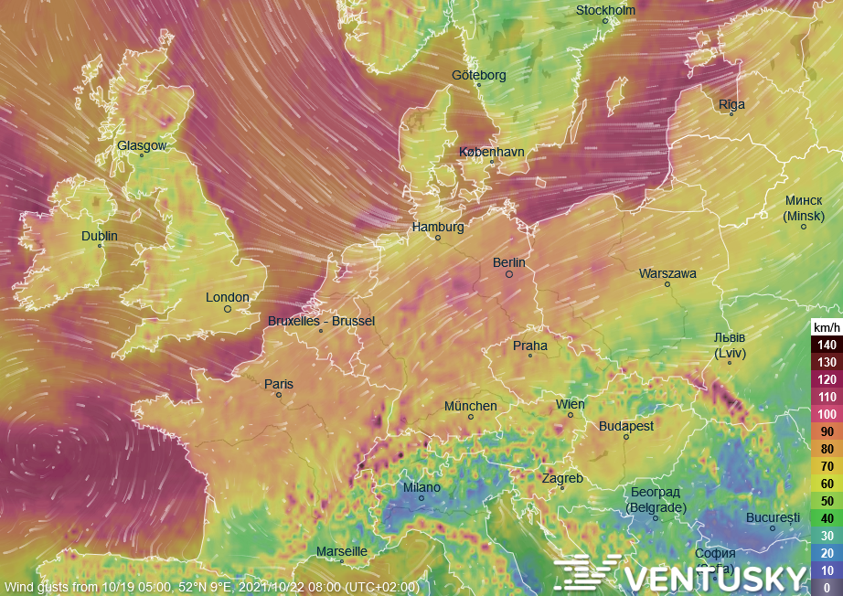 Maximální nárazy větru v příštích 72 hodinách v Evropě podle modelu ICON EU - velkou část Evropy zasáhne vichřice, nejvíce škod způsobí zřejmě v Německu