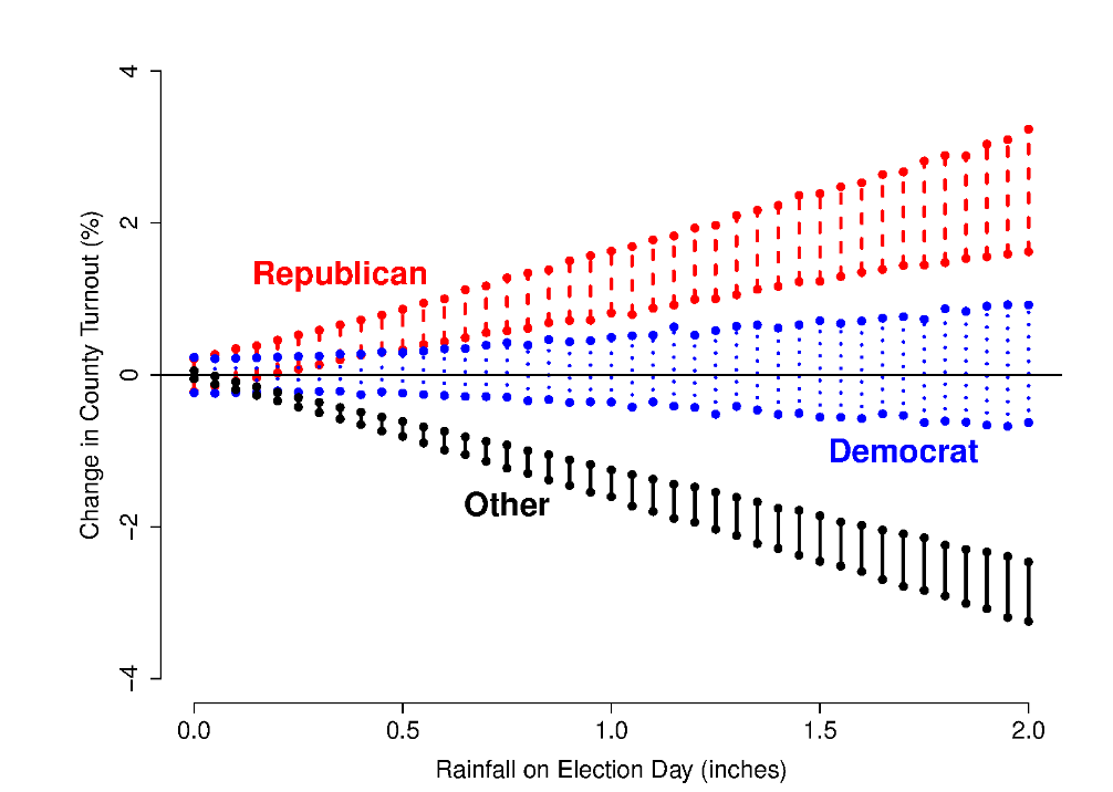 Deštivé počasí se obvykle spojuje s nižší volební účastí - hlavně v oblastech, kde například lidé musejí před volební místností čekat frontu