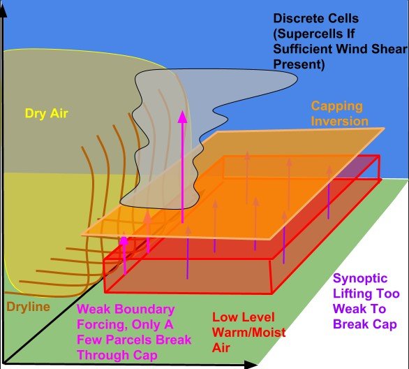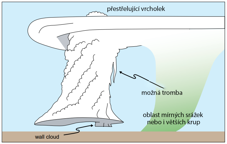 Obr. 2: Schématické znázornění LP supercely - přímo tornádo na schématu znázorněno není, protože LP supercely ho přinášejí jen vzácně (případně by se tvořilo v oblasti wall cloud)