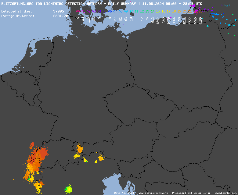 Množství blesků za včerejší den - na západním okraji Alp je patrný konvektivní systém