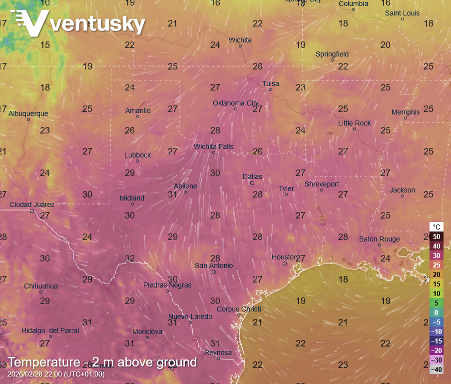 Teplota 28. února v Texasu - na většině míst bylo kolem 30 °C