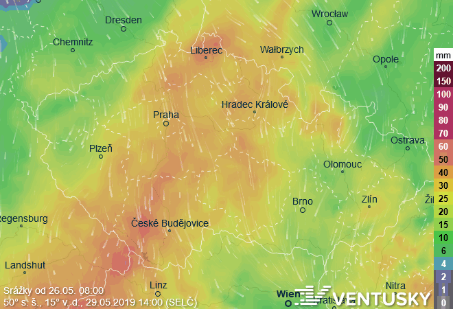 Do středečního poledne naprší většinou od 20 do 30 mm srážek, v Čechách v pásu od Šumavy, přes jih Čech, střední Čechy až po Krkonoše od 30 do 60 mm srážek. Vyšší srážkové úhrny se vyskytnou i mimo hory (s ohledem na spíše slabší vítr bude totiž vliv orografie nižší). Vzhledem k tomu, že vydatné srážky zasáhnou celá povodí, lze očekávat i vzestup hladiny řek s dosažením stupňů povodňové aktivity. Naštěstí ty nejvydatnější deště nezasáhnou stejné oblasti jako v tomto týdnu (okolí Beskyd), kde je již nasycení půdy značné a další vydatné deště by zde způsobily velmi vážné komplikace.