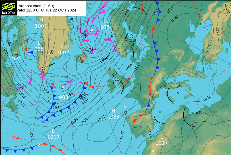Synoptická situace v úterý v poledne - přes naše území začne přecházet slábnoucí studená fronta