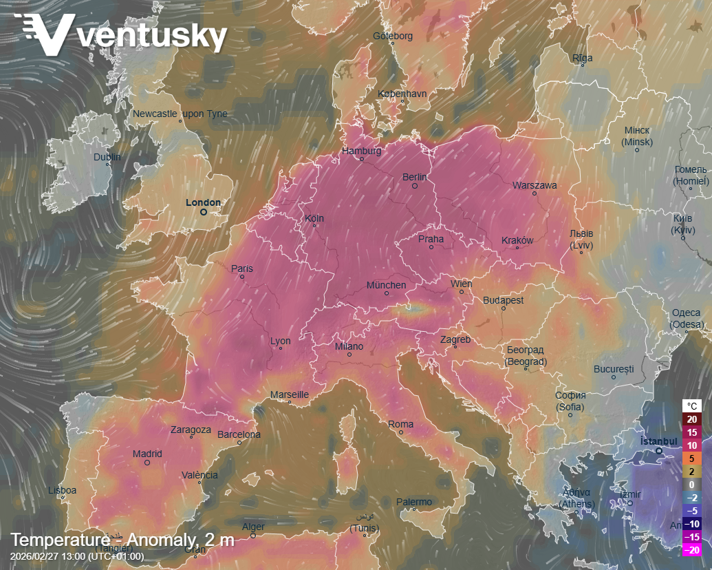 Obr. 2 Rozložení teplot vzduchu v pátek odpoledne a poloha výškových tlakových útvarů (černé linie) v tlakové hladině 500 hPa (přibližně 5,5 km)
