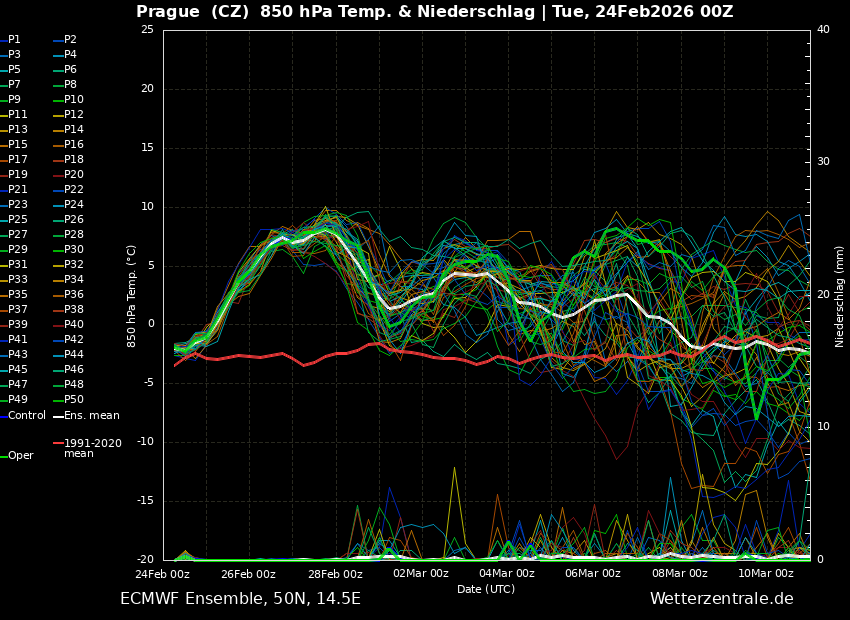 Obr. 3 Ensemblová předpověď teploty vzduchu v tlakové hladině 850 hPa (cca 1,5 km) a srážek podle modelu ECMWF pro Prahu