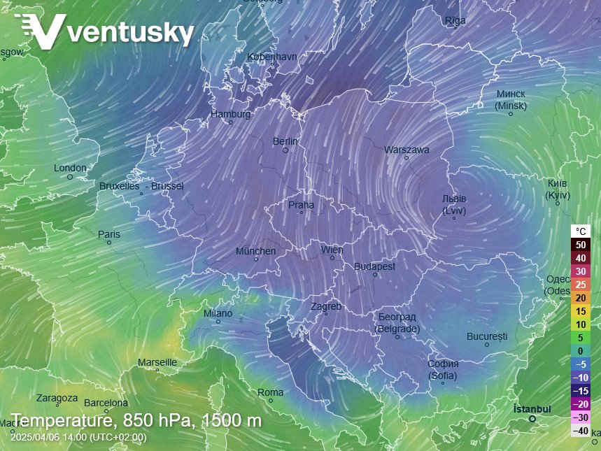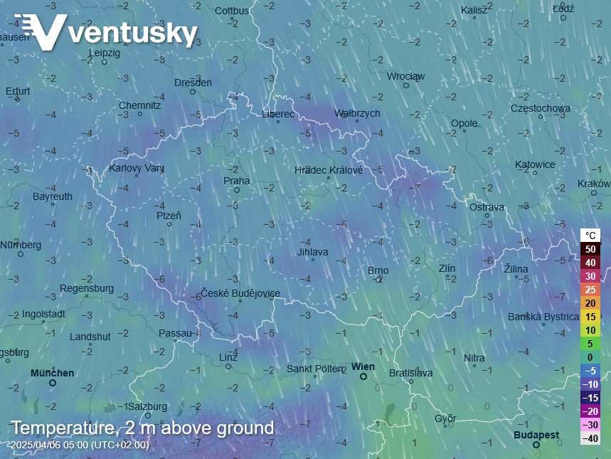 Vývoj sněhové pokrývky (bílou čárou) a dalších meteorologických prvků (srážky modře, teplota červeně) na stanici Dvoračky v Krkonoších za posledních 48 hodin