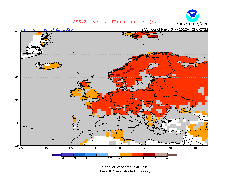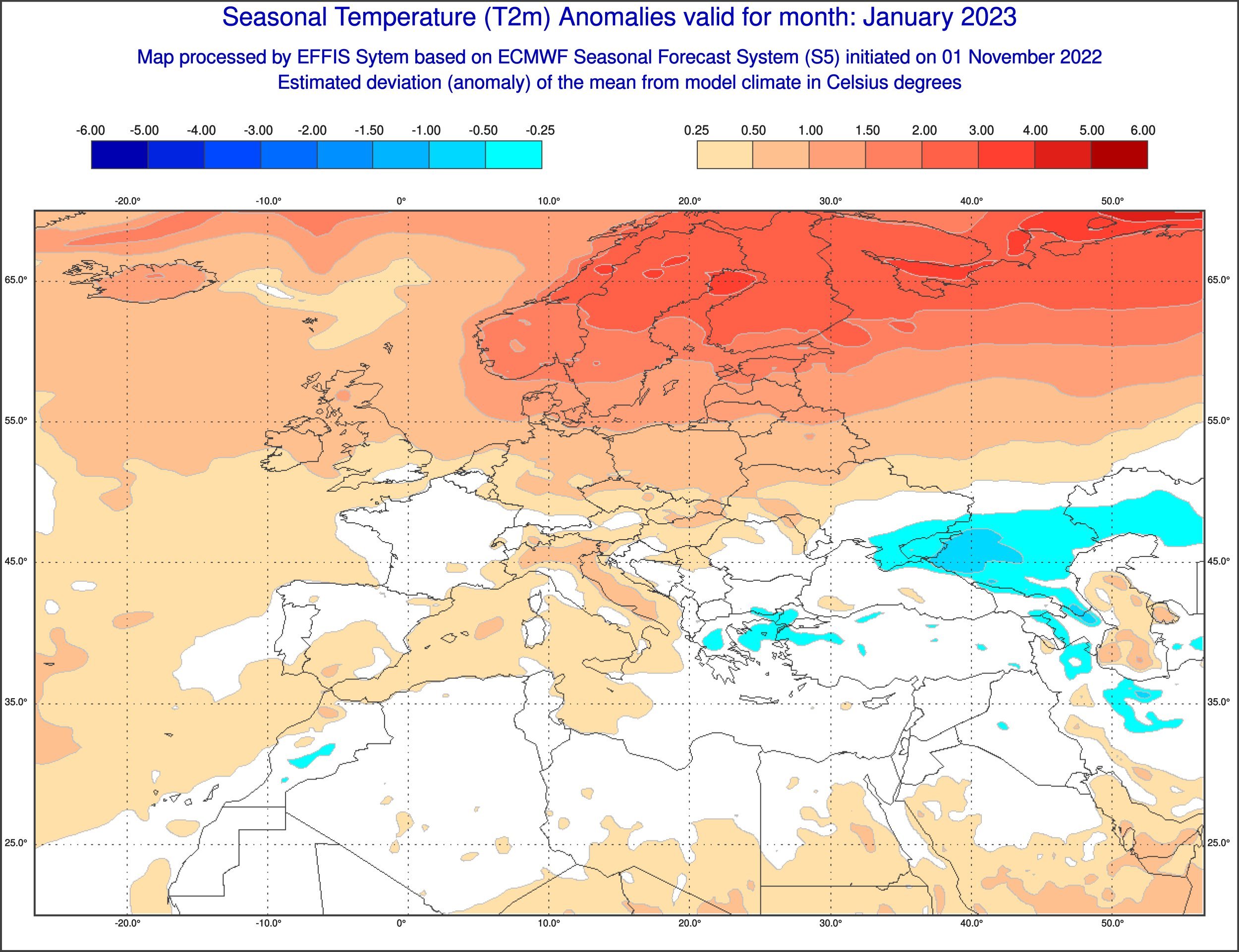 Očekávaná odchylka teploty vzduchu v lednu 2023 vůči dlouhodobému průměru (1993-2016) podle modelu ECMWF - tento měsíc by se u nás měl nejvíce blížit dlouhodobým průměrům