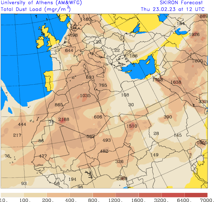 Předpověď množství prachových částic v atmosféře pro 23. února 2023 prostřednictvím modelu SKIRON Athénské univerzity