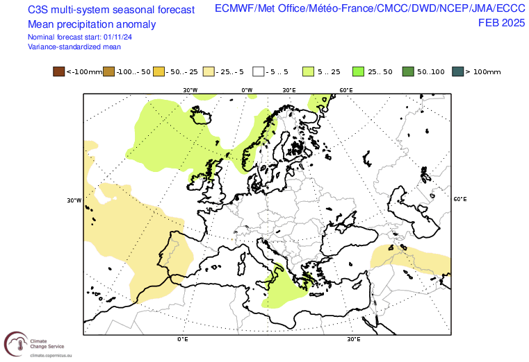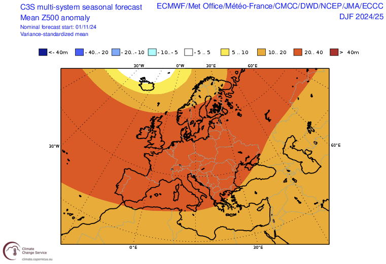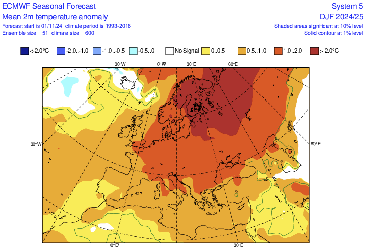 Očekávaná odchylka teploty vzduchu za zimu (prosinec 2024 – únor 2025) v Evropě podle Evropského modelu