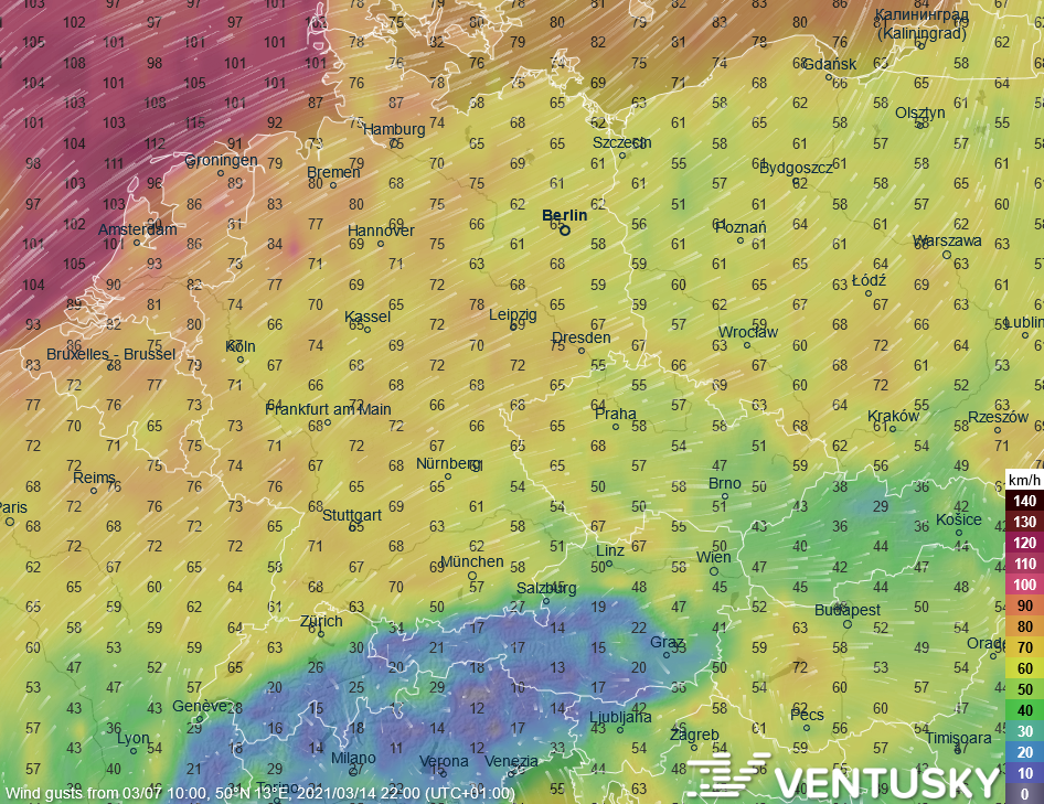Očekávané maximální nárazy větru v příštím týdnu podle modelu GFS ve střední Evropě