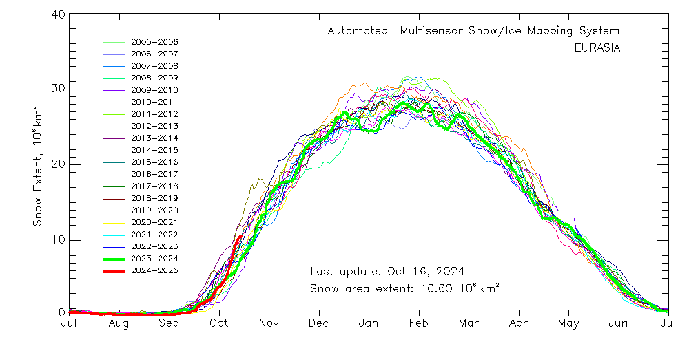 Výška sněhu na euroasijském kontinentu za posledních 20 let – letošní rok tmavě červeně