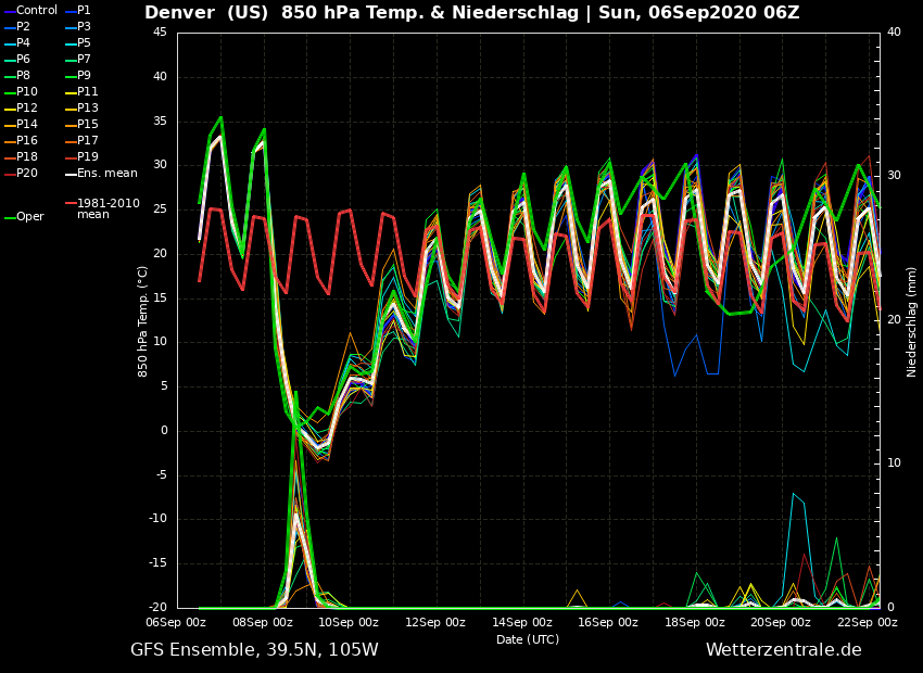 Výrazné ochlazení v Denveru v úterý 8. 9. 2020 na ensemblových předpovědích teploty vzduchu v hladině 850 hPa – pokles téměř o 33 °C (!). Druhá polovina týdne ale přinese návrat k obvyklým zářijovým hodnotám nebo i teploty o něco vyšší.