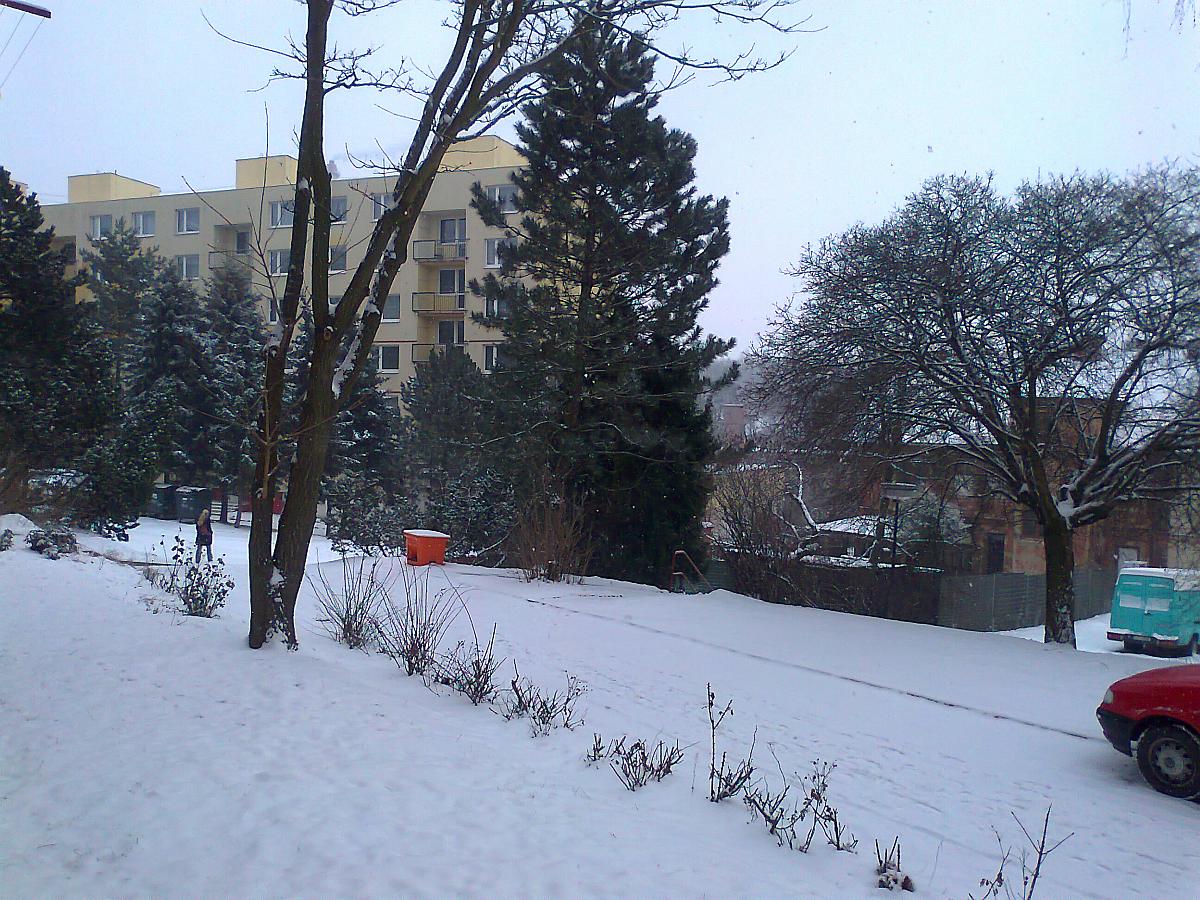 Zataženo, sněží, zákl.mraků 555m, tlak 1011,0hPa, dohlednost 2km, vlhkost 91,1%, dosti čerstvý SSV vítr 30° 6m/s(4 Bft).