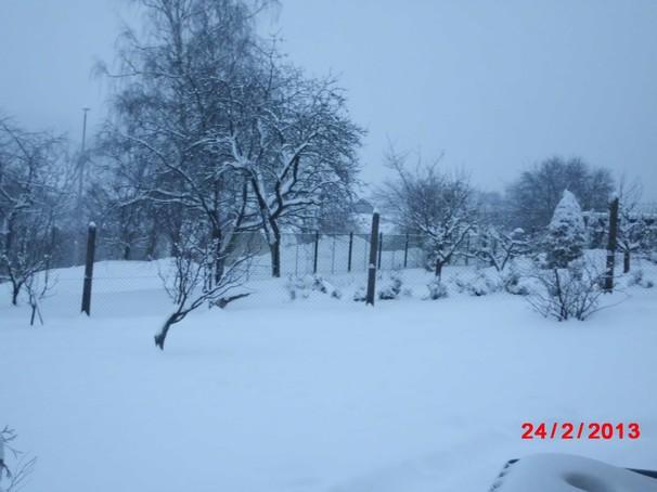 od půlnoci cca do 5:30h sněžilo a připadli 2 cm nového sněhu který trochu slehl jelikož tam slabounce prší ,, vítr 3m/s ,, vlhkost 100% (Foto v 7:10h)