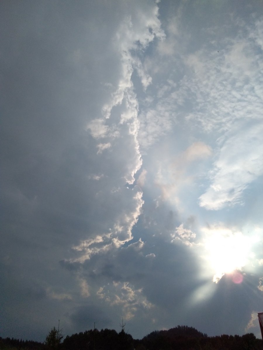 Je polojasno a vítr vane mírný. Když sem byl samořejmně v Jičíně tak tady kolem 15 hod byla průtž mračen a za 20 minut spadlo 22 mm srážek.