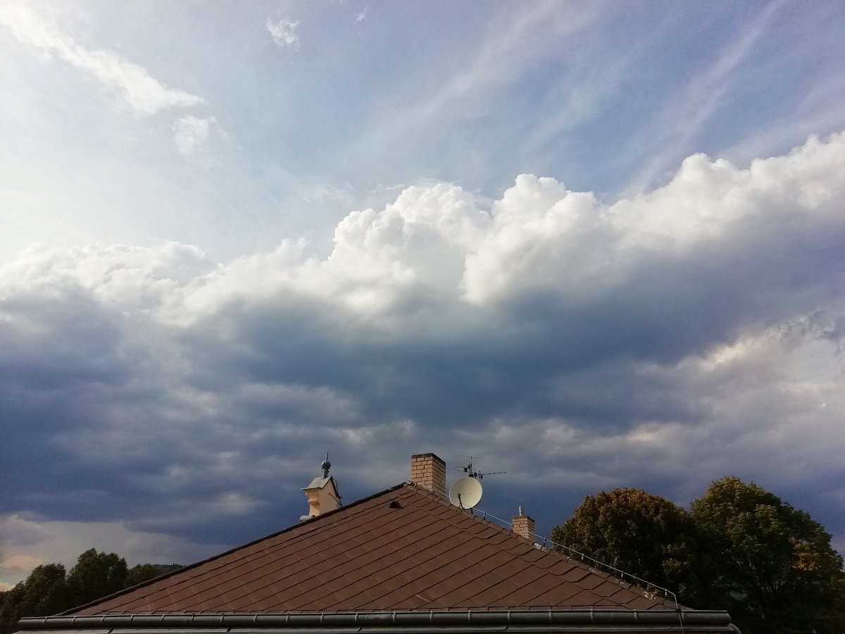před frontou vrcholí příliv teplého vzduchu, slabý jižní vítr, v nárazech 18 km/hod, tlak jde dolů 1007 hPa