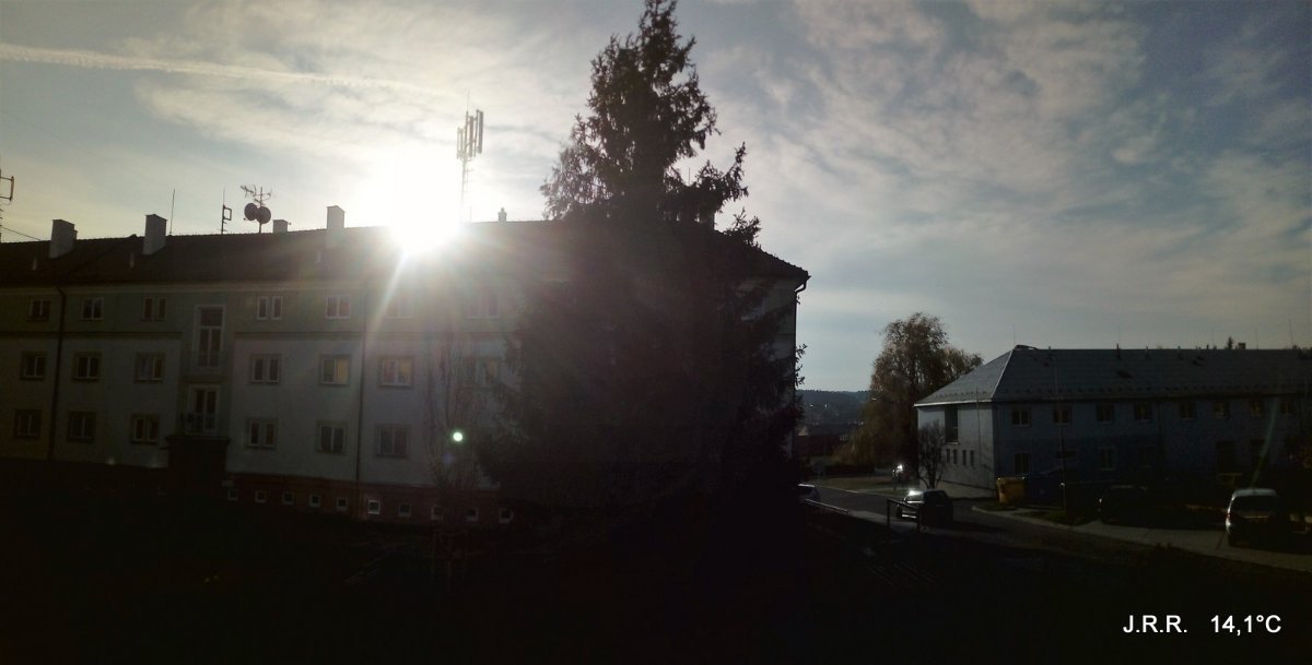 Končí další teplý a slunečný den. Nyní již přibývá vysoká oblačnost od západu. Vane slabý jihovýchodní vítr, tlak: 1015 hPa. Max. teplota 16,6°C min. 6,7°C.
