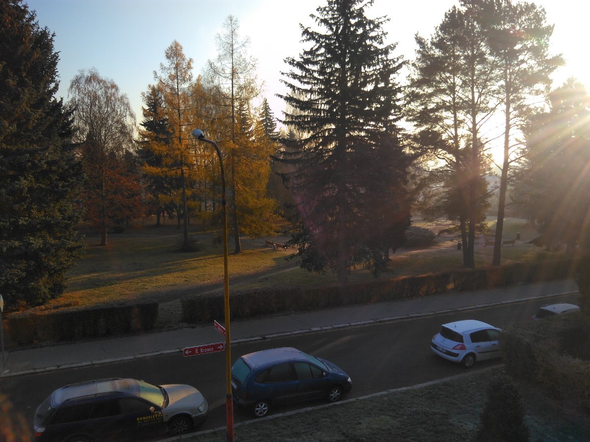 Bezvětří, tlak 1031,6 hPa, vlhkost 90%. Dnešní minimum bylo -3,5 °C.