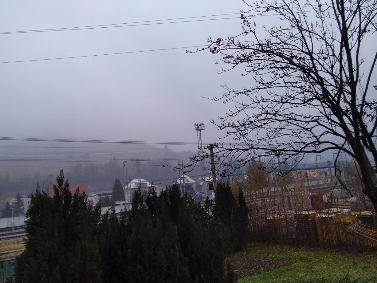 ranní min. -0.1°C, sníh už jen místy a je nesouvisí a drží se převážně mimo město, ve městě skoro už není, Nyní: zataženo, mlha, mrholí, 0.3°C