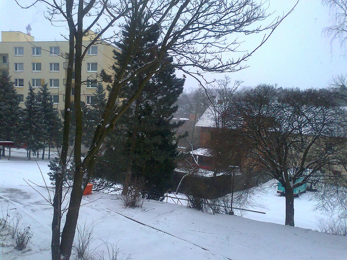 Intenzita sněžení se mění,vitr sníh sfukuje ze střech,připadám si jak v lednu