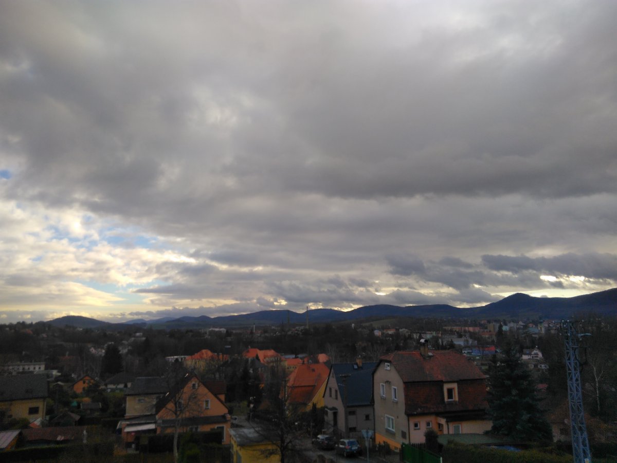 celkově 6/8 oblačnosti více pater , dohled 10 až 15 km , rel.vlhkost 78 procent , SZ až Z vítr 2 až 7 občas v poryvech 11 m/vt , tlak 1009,5 hPa ...