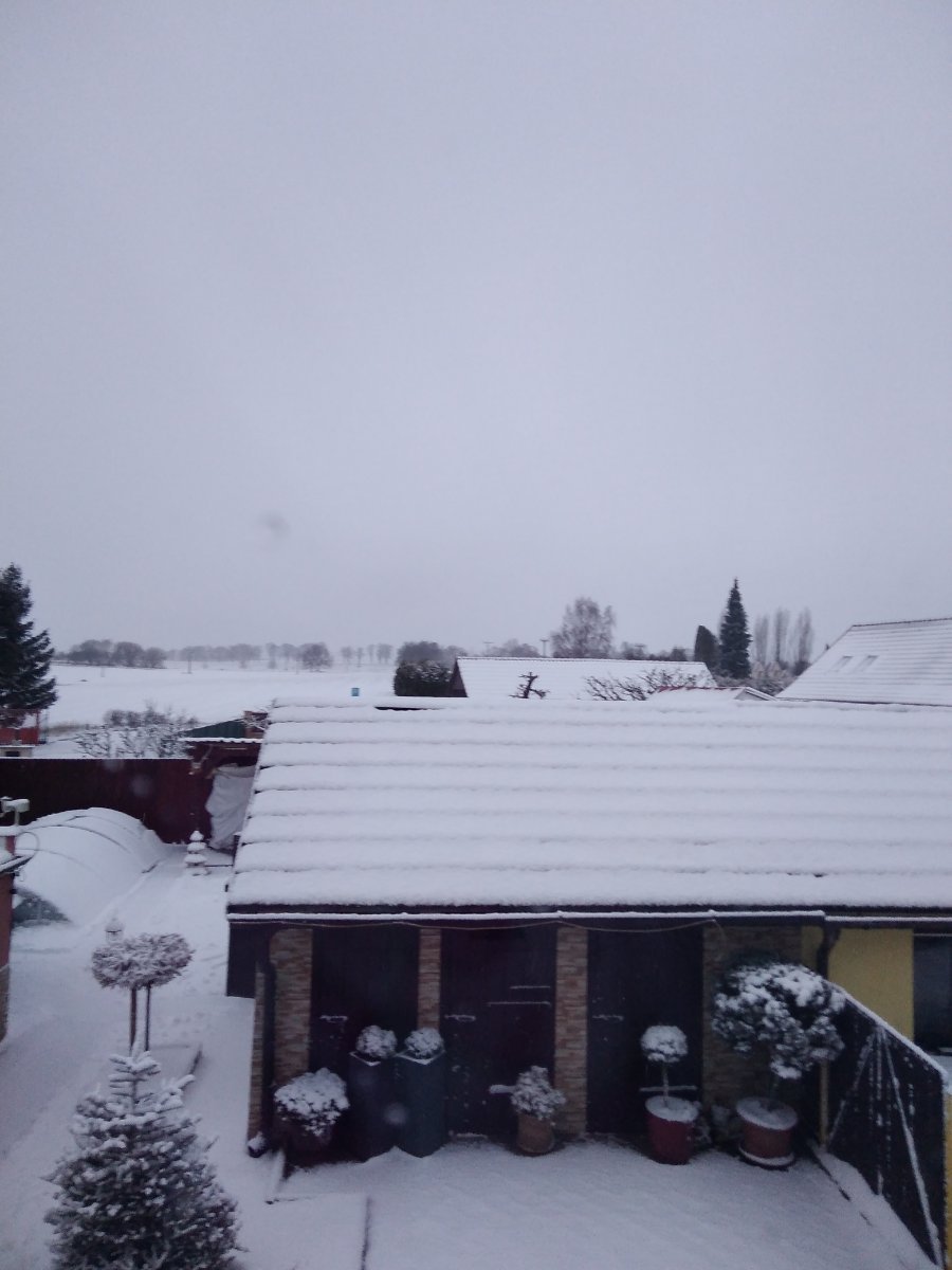 Občasné slabé sněžení, slabý až mírný Z vítr, tlak 1013,6 hPa.