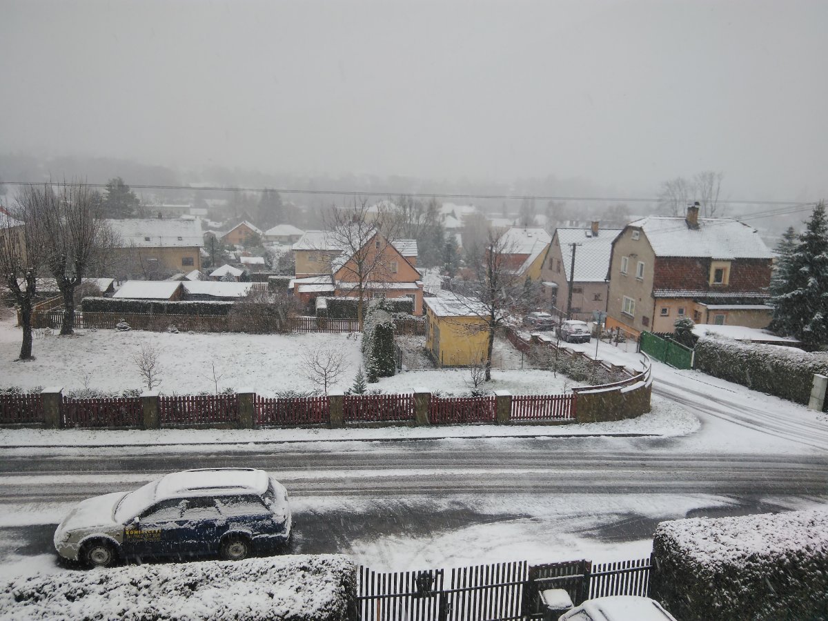 Konečně hustě sněží. Tlak 1009 hPa, vítr J, vlhkost 95%.