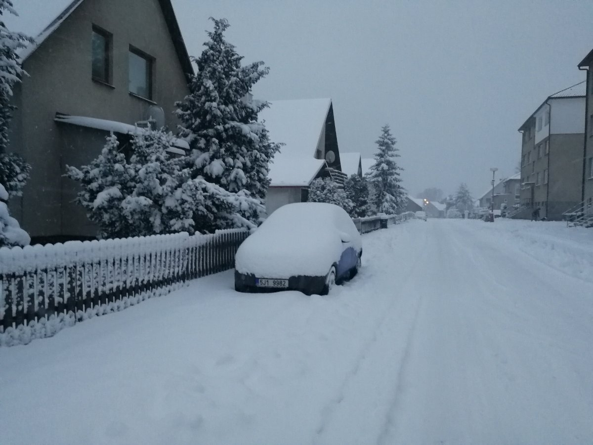 sněží, sníh zatím nepřibývá, slabý až mírný vítr, výška sněhu: nesouvislá do 2cm