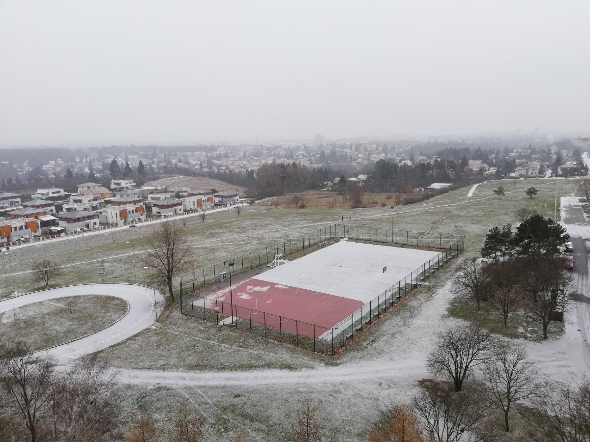 Je zataženo a slabounce sněží a je bezvětří.