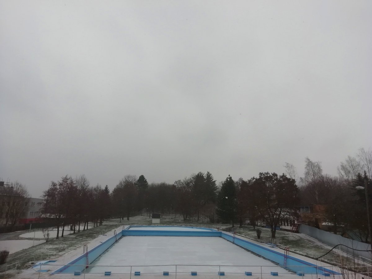 trvalé drobné sněžení, slabý v nárazech až mírný vítr, -1.8°C