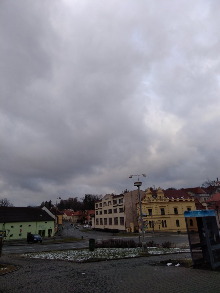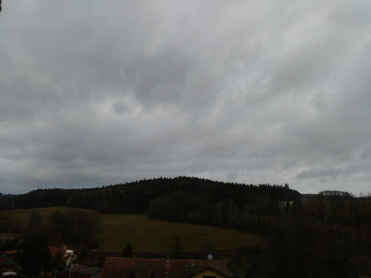 Po ranním docela vydatném sněžení přes den už spíš pršelo nebo mrholilo max se mezi kapkama objevila nějaká ta vločka a čerstvě napadaný sníh postupně roztával aktuálně převažuje většinou oblačno až skoro zataženo a sem tam spadne nějaká kapka vody a fouká většinou slabý až mírný vítr a nový sníh už zcela zmizel zůstávají jenom poslední zbytečky ale někde zbyly ještě poslední zbytky starého sněhu vlhkost 88%