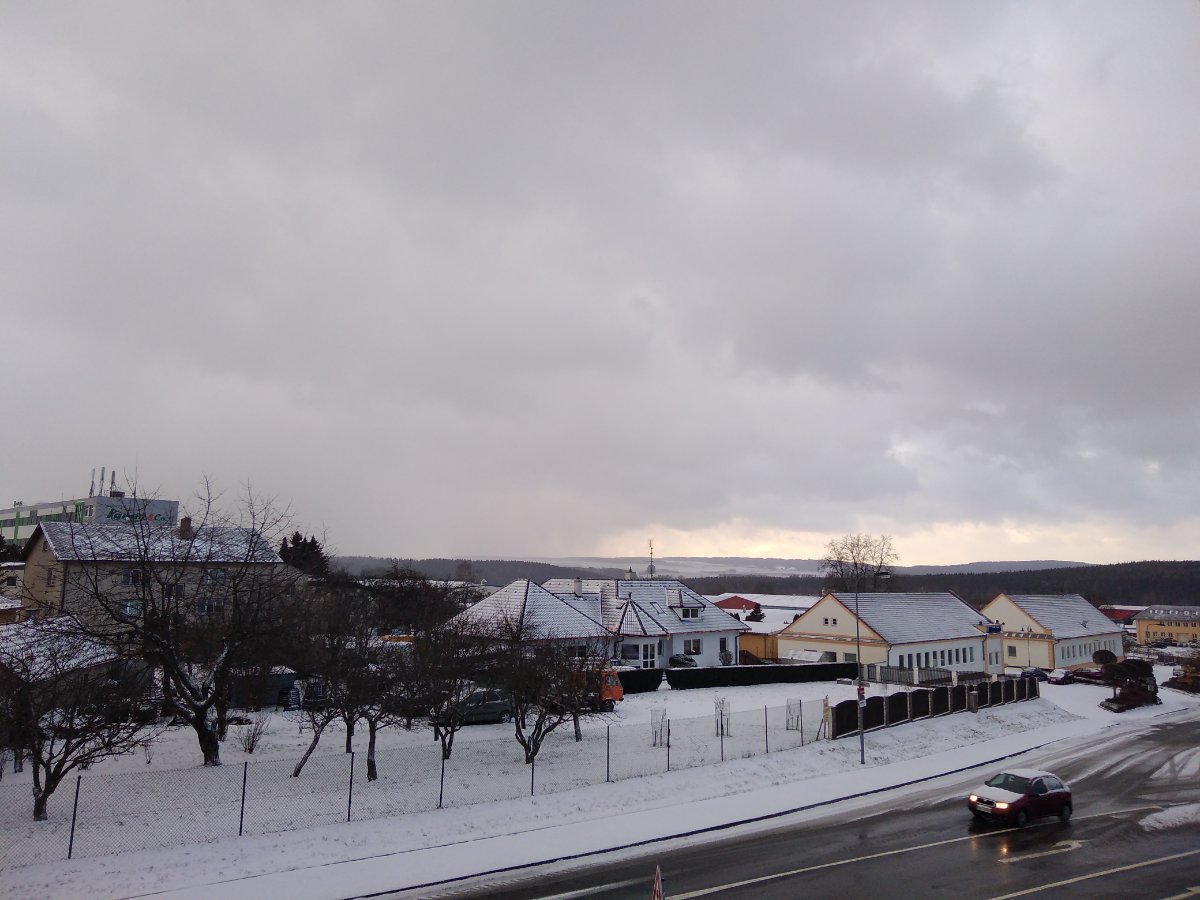 Silná sněhová přeháňka. Severozápadní vítr 25,8 km/h, tlak 1015,3 hPa, vlhkost 90%.