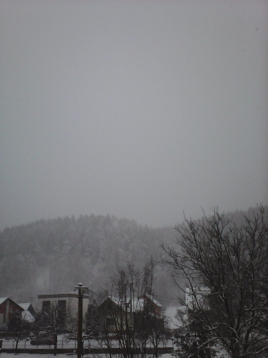 do rána min. -4.8°C, zatím 2cm rozfoukaného sněhu, Nyní: mírně až silně sněží a sníh pěkně přibývá, mírný vítr, -3.7°C