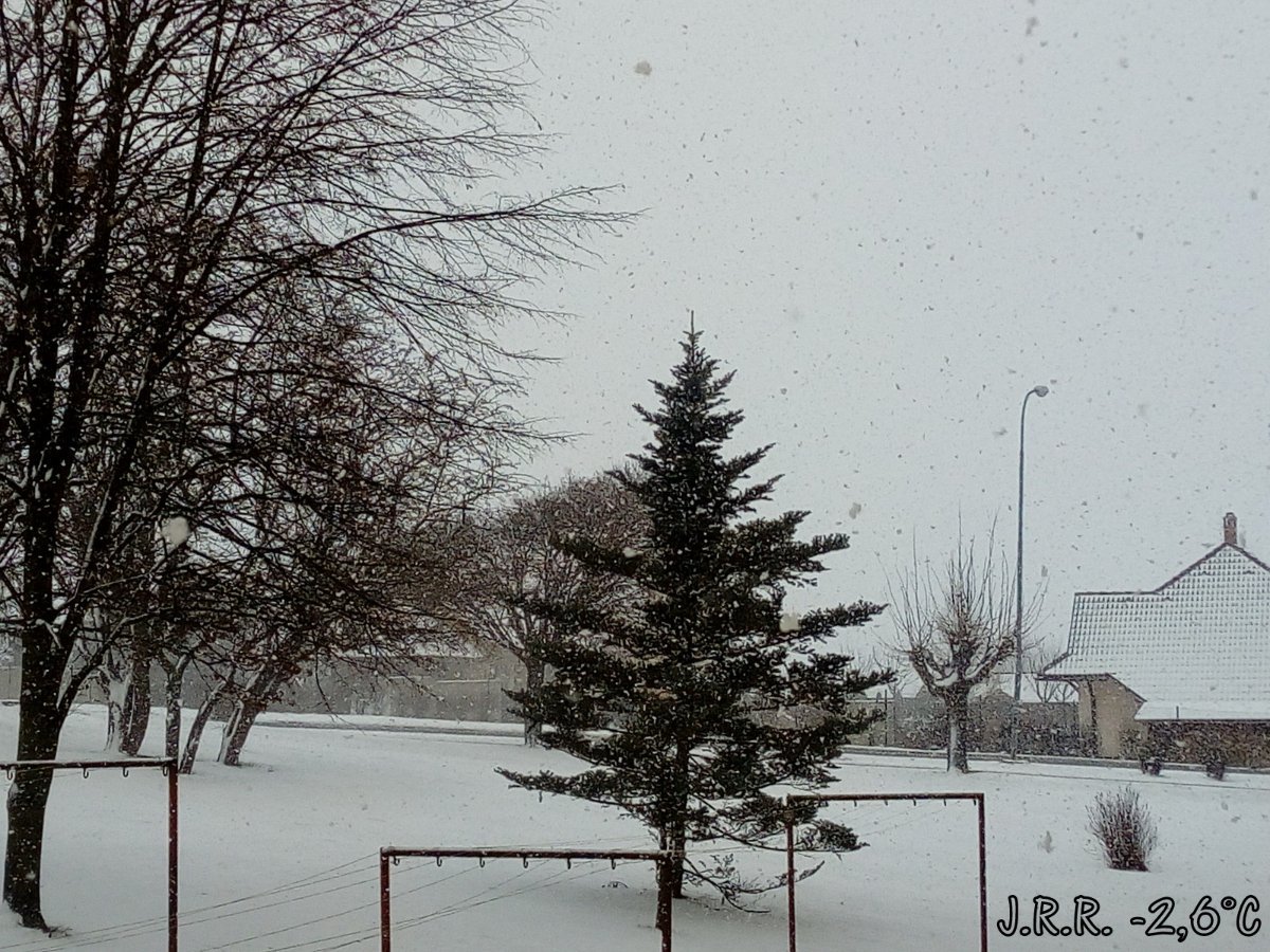 trvale sněží, mírný vítr v nárazech až čerstvý, Aktuálně bílá tma silně sněží, -3.3°C