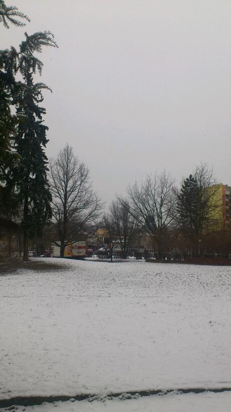 Tlak 1001 hPa, vlhkost vzduchu 86 %, stále hustě sněží,severozápadní proudění.Nu a dole pohled ze zafujaného okna.