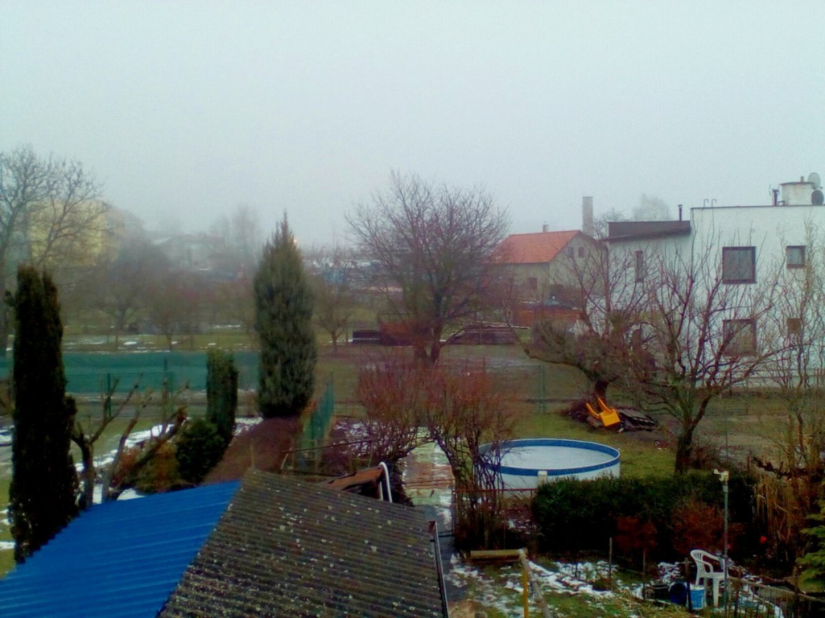 Výborný sníh na sněhuláky. Sněžit začalo brzy ráno, po poledni to přešlo v mrholení, od 16h opět občas slabě sněží.