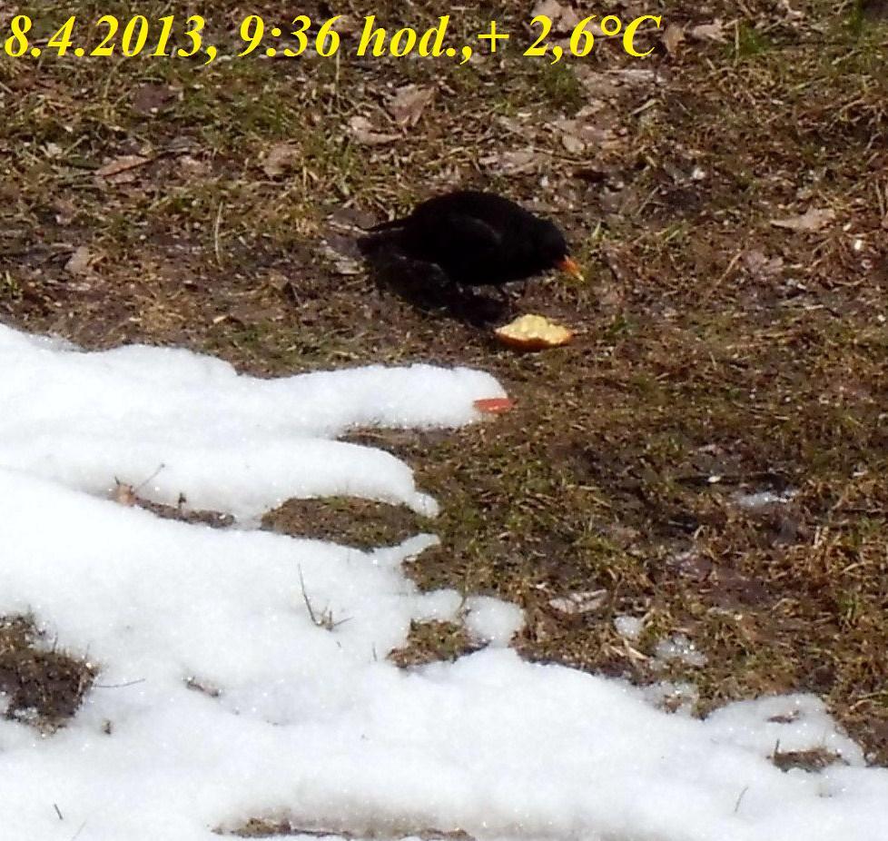 foto z 2013 04 08 v 08:53 ukazuje, jak si sluníčko poradilo s jinovatkou. V 8 hodin sluníčko svítilo přímo na teploměr a bylo +14°, když jsem fotila tak už byl teploměr ve stínu a ukazoval +4° a nyní klesl ještě o 1°-snad už zase poleze směrem vzhůru - je krásný pohled z okna
