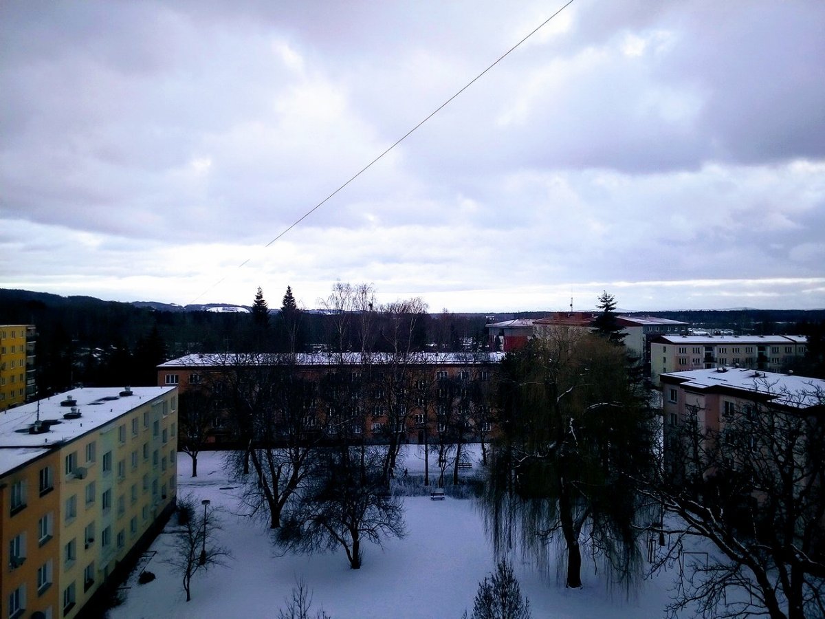 oblačno, sněhové přeháňky, slabý až mírný vítr, výška sněhu místy nesouvislá do 2cm, 0.7°C