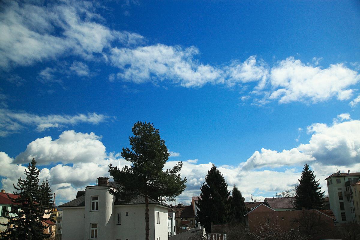 Oblačno, kolem 8. hodiny slabá přeháňka