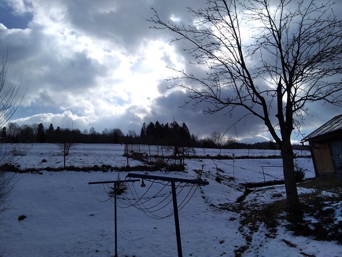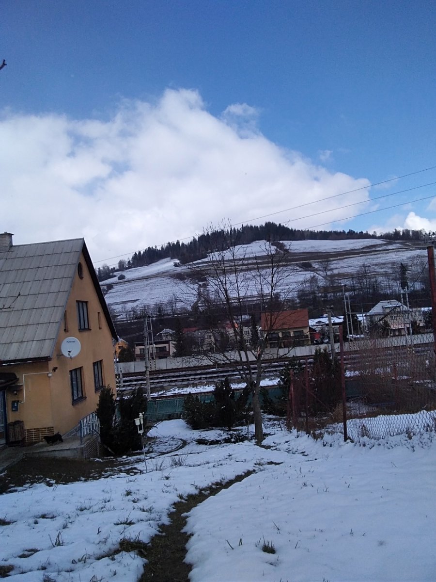 Oblačno občasné sněhové přeháňky padá krupice, slabý v nárazech mírný vítr, do rána poprašek který už zmizel, dnešní minimální teplota, -0.5°C