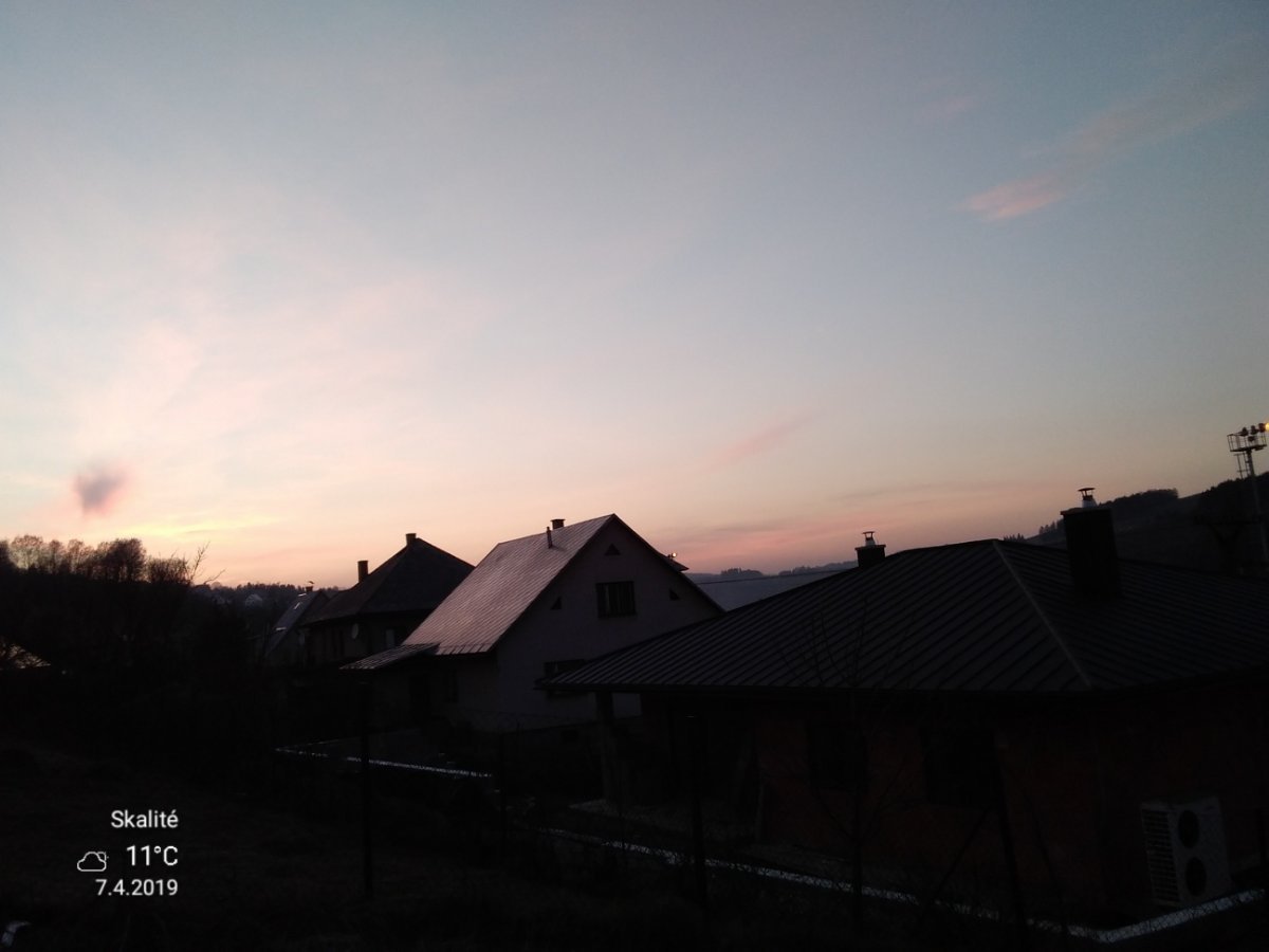 Docela se rychle vyjasnilo za tu hodinu teď je na obloze většinou skoro jasno a fouká většinou vánek a na Z obzoru se vytvořily červánky po západu slunce vlhkost 64%