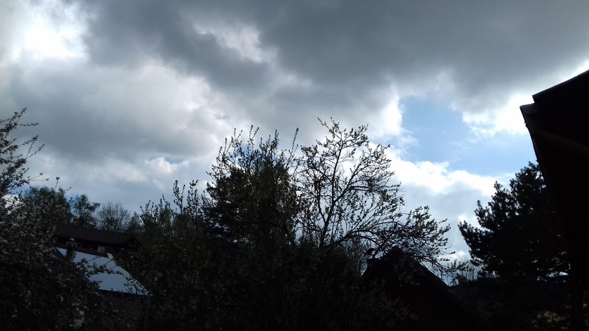 Ráno pár loužiček po nočním deštíku, chladné polojasné dopoledne, nyní přibývání oblačnosti a na obzoru černé bouřkové mraky...