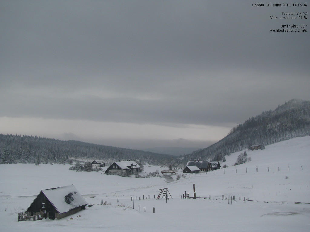 Zatím je zataženo a mlhavo. Blíží se srážkové pole. Snad chumelení. Večerní lyžování, foto ze sjezdovek v Čenkovicích. Více na www.obeccenkovice.com